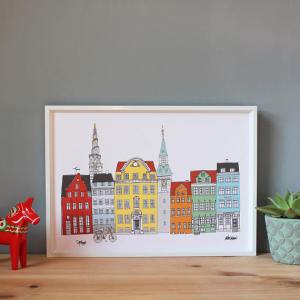 A fabulous A4 print on Etsy of a pretty Copenhagen cityscape style illustration, featuring some of the beautiful buildings in the city. With waterside Nyhavn buildings, with some of the cities towers in the background. The illustration is digitally coloured and printed onto a high quality 170gsm matte paper. Digitally coloured in pretty pastel shades. It’s a Helen Carrington print available on Etsy for only £15.
